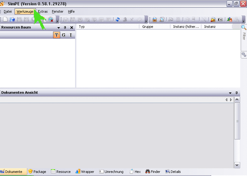 - Du siehst nun in der dreigeteilten Programmoberfläche links oben - "Resources"-Dateinbaum, recht daneben "Typ", "Gruppe" usw.und unten noch nix.